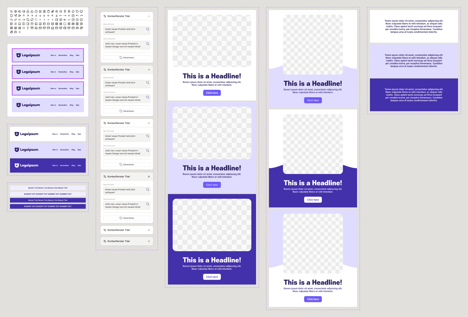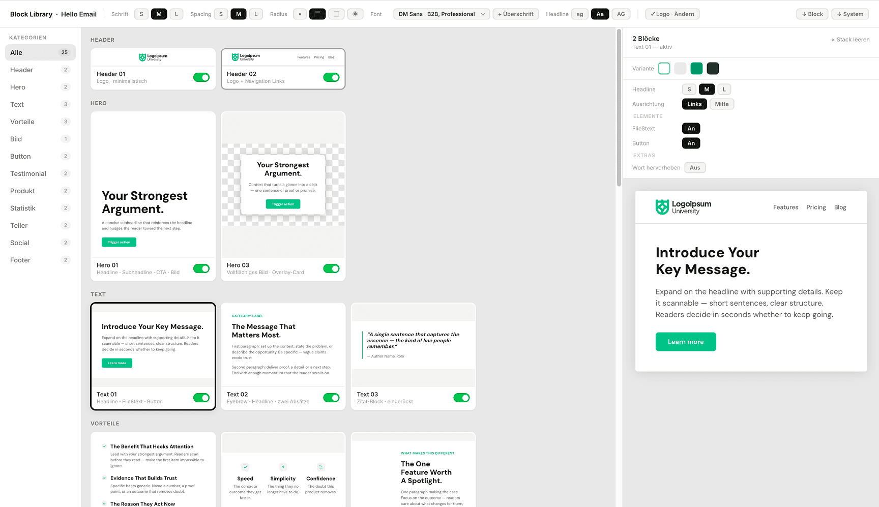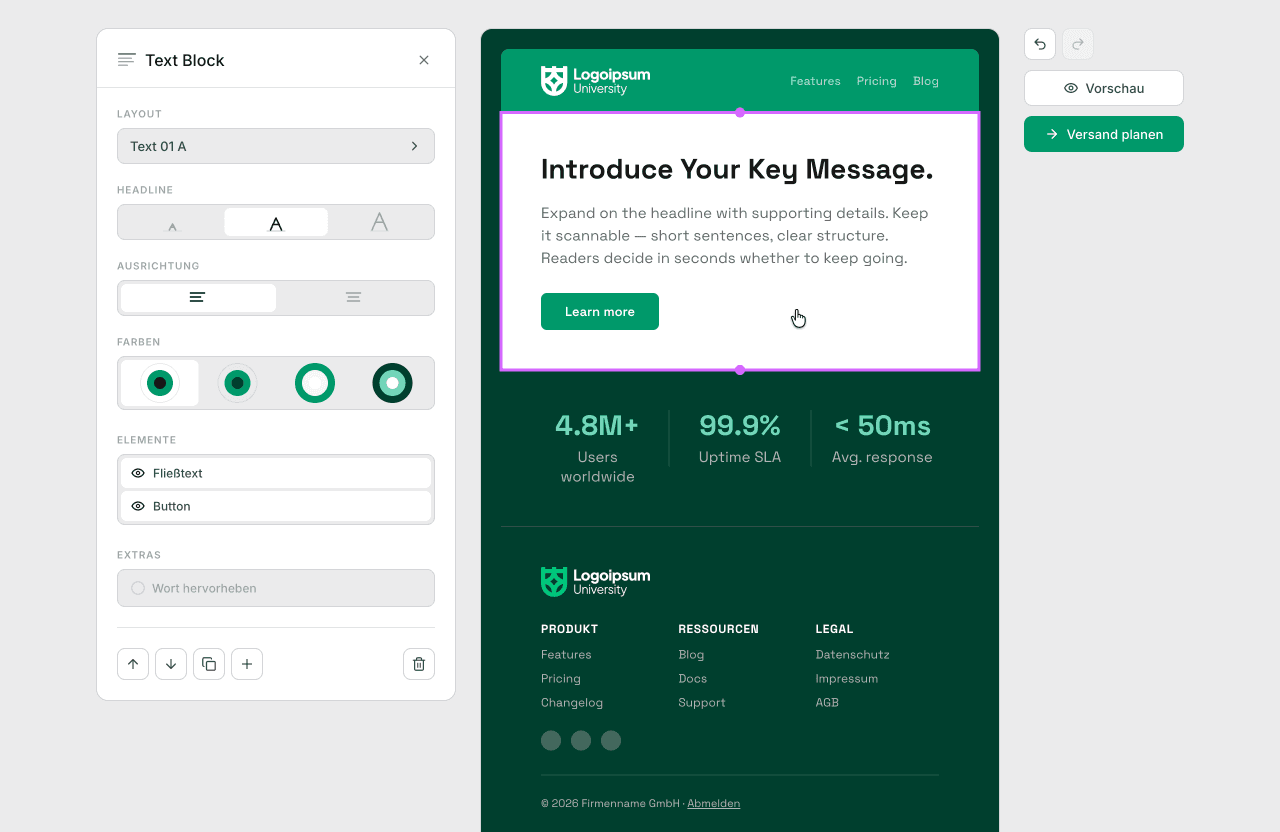 The fundamental shift was to stop thinking in individual text blocks and image blocks that can all be freely styled. That model works for designers, not for people who just want a good-looking email. Instead, the system offers pre-designed sections — a hero, a feature grid, a spotlight — where each one already follows the right design principles and is flexible enough to adapt to any brand, any content, any combination of settings.