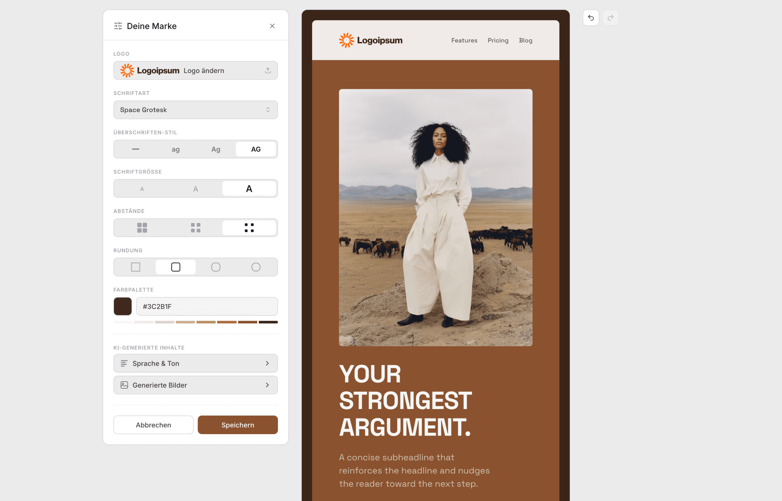 Typography, spacing, and proportions are controlled through three scales: S, M, and L. One brand colour generates a full palette with four variants per section. The user makes a handful of choices; the system makes hundreds of consistent decisions from them.