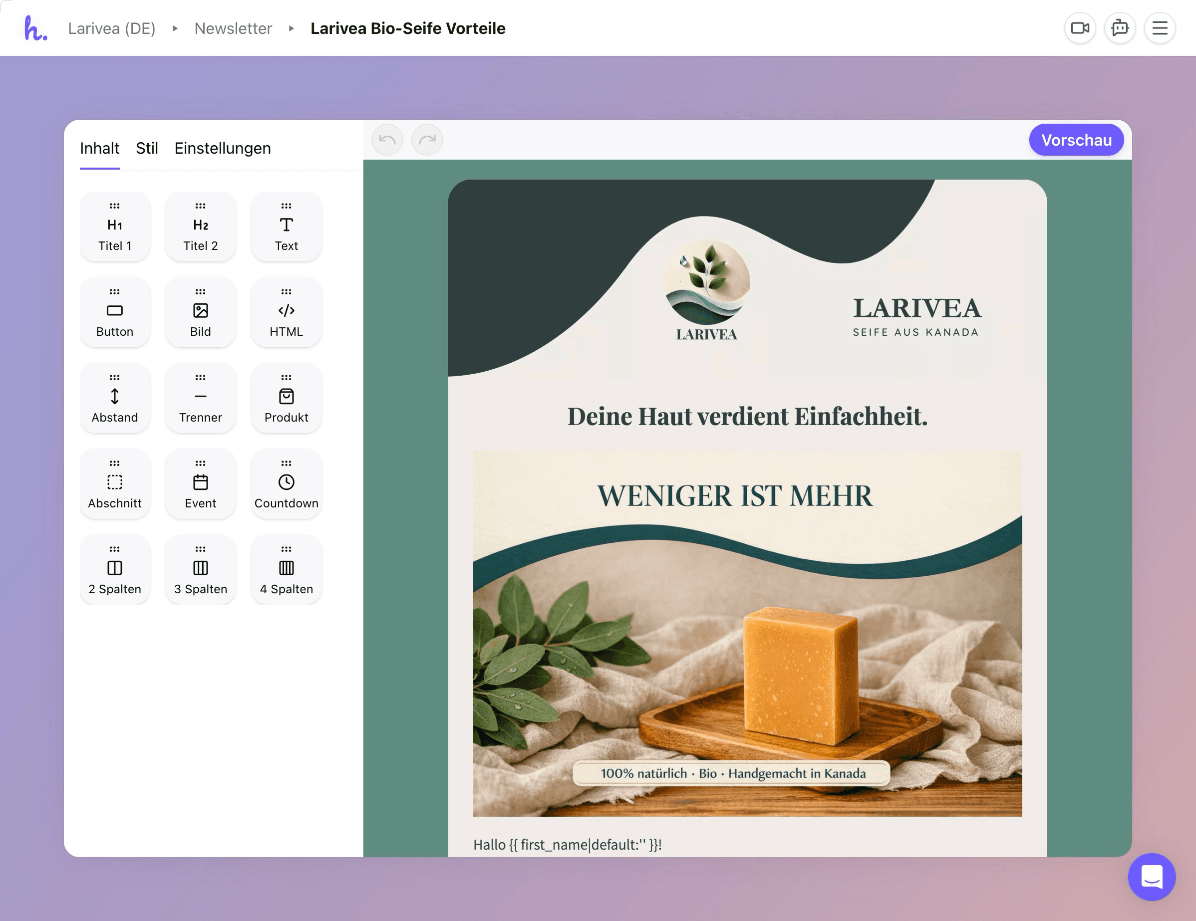 Most emails follow a pattern: the first and last sections stay the same across campaigns. The template editor lets users define that frame once, the AI fills in the middle, and the result already feels like their email before they've touched anything.
